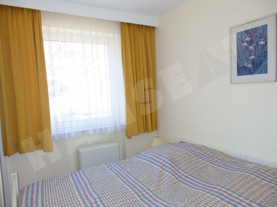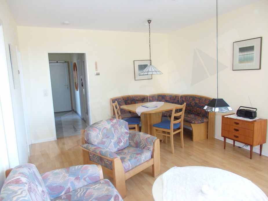 Eine gemütliche Ferienwohnung, die über Wohnzimmer mit Eckbank und Esstisch und Sitzgruppe verfügt. Eine separate Einbauküche hat Backofen, Kühlschrank und Geschirrspüler. Die Wohnung hat Laminatfußböden, im Flur- und Badbereich Fliesen. Die zwei Schlafzimmer gehen vom Wohnzimmer ab und haben ein Schlafzimmer mit Doppelbett und ein Kinderschlafzimmer mit einem Einzelbett und einem Etagenbett.