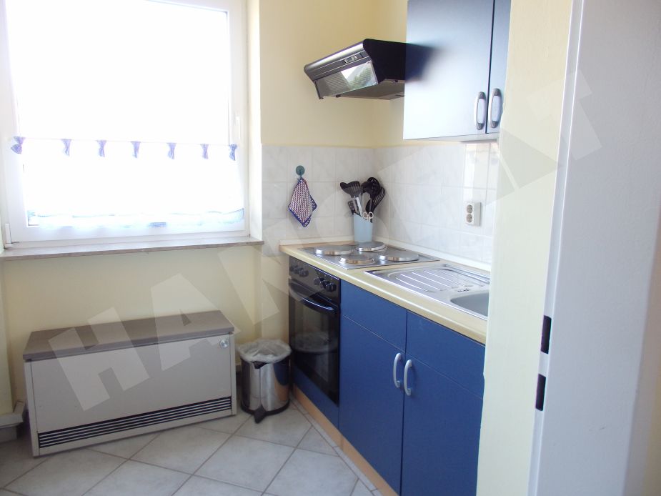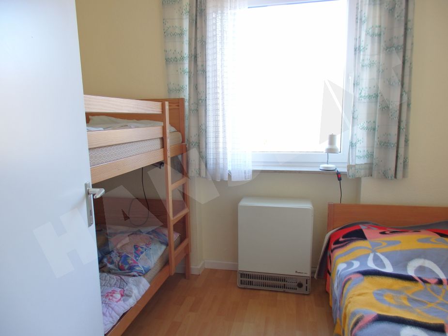 Eine gemütliche Ferienwohnung, die über Wohnzimmer mit Eckbank und Esstisch und Sitzgruppe verfügt. Eine separate Einbauküche hat Backofen, Kühlschrank und Geschirrspüler. Die Wohnung hat Laminatfußböden, im Flur- und Badbereich Fliesen. Die zwei Schlafzimmer gehen vom Wohnzimmer ab und haben ein Schlafzimmer mit Doppelbett und ein Kinderschlafzimmer mit einem Einzelbett und einem Etagenbett.